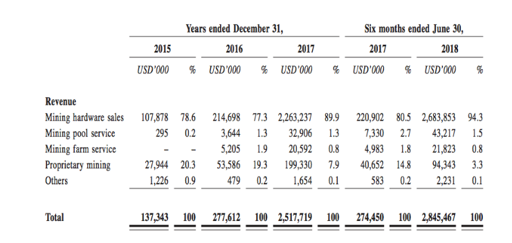 “In additional to offering products and services to our customers, we also engage in proprietary mining. To capture the profitable returns of cryptocurrency mining, we will utilize mining hardware to mine cryptocurrencies ourselves”. In terms of revenue generated by mining, self-mining has been steadily declining from 20.3% of total revenue in 2015, 19.3% in 2016, 7.9% in 2017, and 3.3% in (the first six months) of 2018.