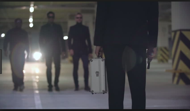Now we see two black cars pull up, and there are suddenly like 10 other guys in suits and sunglasses on each side. The two main guys (usually with super expensive suits and watches) walk to the midpoint in slow-mo and exchange suitcases at the same time.